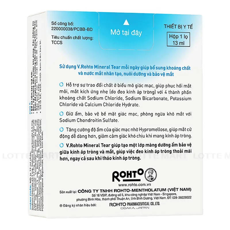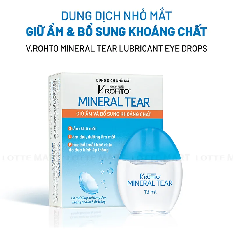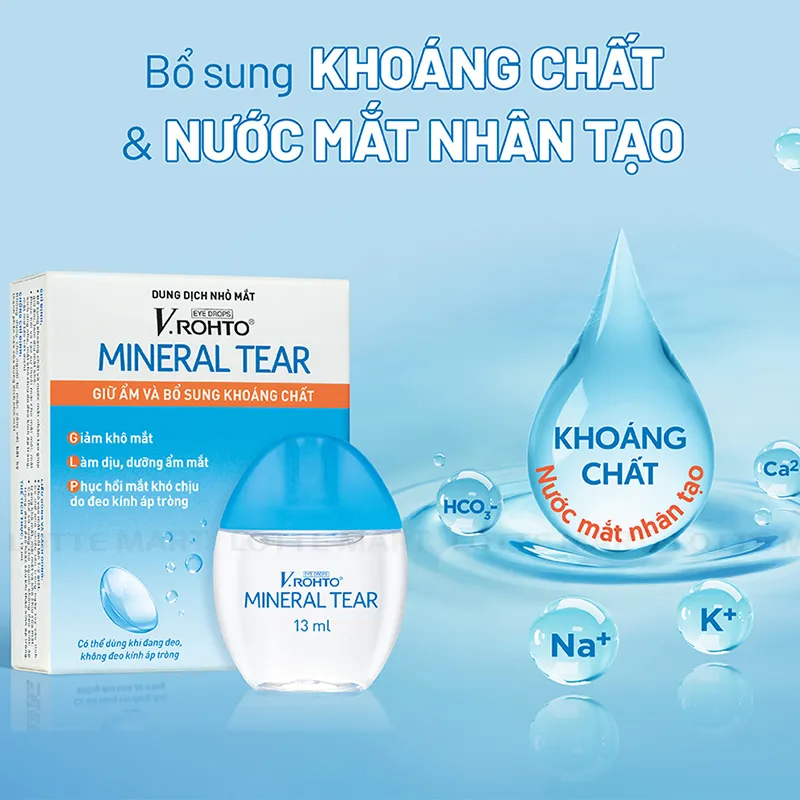 - Dung Dịch Nhỏ Mắt V.Rohto Mineral Tear 13ml là dung dịch nhỏ mắt bổ sung nước mắt nhân tạo, cung cấp các nguyên tố tương tự như nước mắt tự nhiên, giúp tái tạo lại nước mắt, giữ ẩm và làm dịu mắt khô; Hỗ trợ sự trao đổi chất ở biểu mô giác mạc, giúp phục hồi mắt mỏi, mắt kích ứng nhẹ với 4 thành phần khoáng chất Potassium Chloride, Sodium Chloride, Calcium Chloride Hydrate, Sodium Bicarbonate.