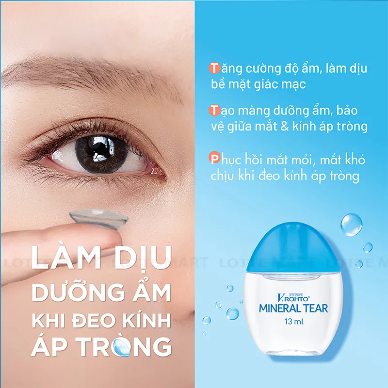 - Ngoài ra, đây còn là sản phẩm nhỏ mắt có thể dùng được ngay cả khi mang kính áp tròng. Đặc biệt, V.Rohto Mineral Tear dưỡng ẩm, tạo lớp màng giữa mắt và kính áp tròng, điều này giúp bảo vệ mắt, tạo cảm giác thoải mái, dễ chịu khi đeo và tháo kính. Thao tác tháo - lắp kính áp tròng cũng trở nên dễ dàng hơn nhờ lớp màng ẩm mà dung dịch nhỏ mắt mang lại.