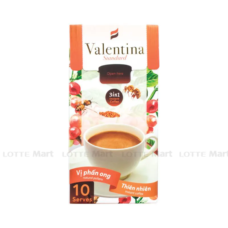 Cà phê Sữa 3 In 1 Valentina là một sản phẩm cà phê hòa tan độc đáo trên thị trường. Không những phù hợp với người ăn kiêng, Valentina còn mang nhiều lợi ích khác như giải nhiệt, thanh mát cơ thể... Thành Phần: Tinh cà phê (13%), Phấn hoa (3%), Sữa thực vật và đường phèn Uống lạnh: Bước 1: Hòa tan 1 gói vào 70ml nước nóng Bước 2: Khuấy đều, thêm 100g đá và thưởng thức. Uống nóng .Hòa tan 1 gói vào 100 ml nước nóng, khuấy đều và thưởng thức. Bảo quản nơi khô ráo, thoáng mát.
