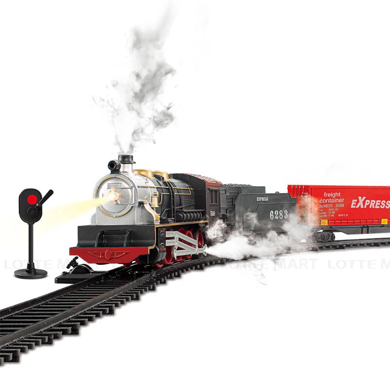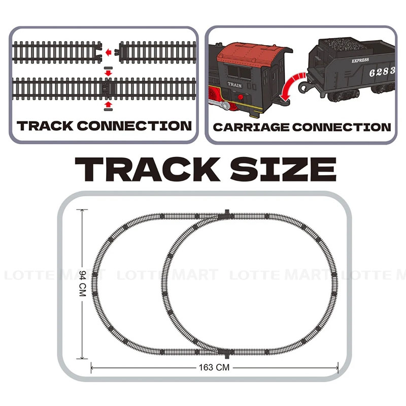 - Sản phẩm có thể lắp ráp thành đường ray hai vòng chạy hoàn chỉnh, gồm 1 đầu tàu chạy pin, kéo theo 2 toa tàu phía sau.