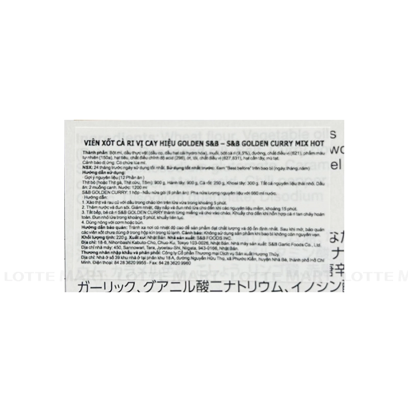 - Viên Cari Golden S&B Vị Cay 220G được sản xuất trên dây chuyền công nghệ hiện đại, dưới sự giám sát của các chuyên gia Nhật Bản. Mỗi sản phẩm của S&B phân phối đều đảm bảo được đầy đủ các tiêu chuẩn về chất lượng và vệ sinh an toàn thực phẩm.