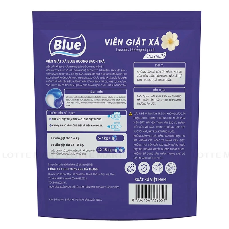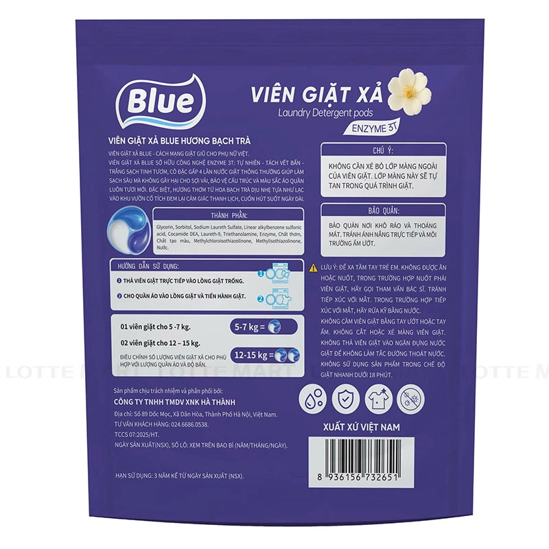 Viên Giặt Xả Blue Hương Bạch Trà được tích hợp hệ enzyme tự nhiên giúp "tách – cắt – loại bỏ" các vết bẩn cứng đầu như dầu mỡ, cà phê, bùn đất nhanh chóng mà không làm hại cấu trúc sợi vải.