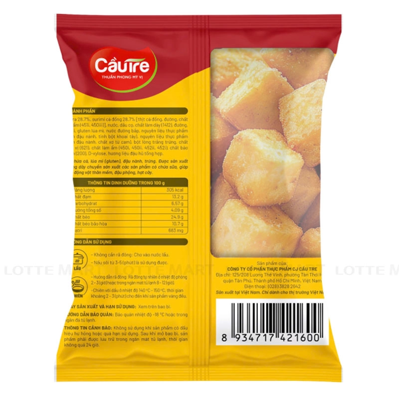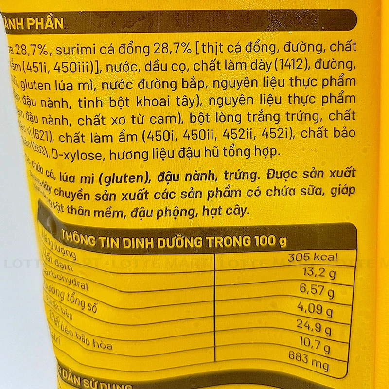 - Cá tra 28.7%, surimi cá đổng 28.7% (thịt cá đổng, đường, chất tạo ẩm, nước, dầu cọ, chất làm dày (1412), đường, gluten lúa mì, nước đường bắp, nguyên liệu thực phẩm (bột đậu nành, tinh bột khoai tây), chất xơ từ cam, bột lòng trắng trứng, chất điều vị (621), chất làm ẩm, chất bảo quản, D-xylose, hương liệu đậu hũ tổng hợp.