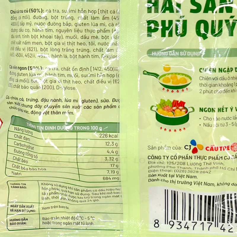 - Chả cá rau củ (50%): cá tra, surimi hỗn hợp [thịt cá (cá đồng, cá mối), đường, bột trứng, chất làm ẩm (451i, 450iii)], bắp mỹ, nước đường bắp, gluten lúa mì, cà rốt, đường. dầu cọ, hành tím, nguyên liệu thực phẩm (đạm đậu nành, tinh bột khoai tây), muối, dầu mè, bột giấm, chiết xuất nấm men, bột gia vị thịt heo, tỏi, nước mắm, chất điều vị (621), bột lòng trắng trứng, chất làm ẩm (450i, 450ii, 452ii, 452i), hành lá, bột hành tím, D-xylose.