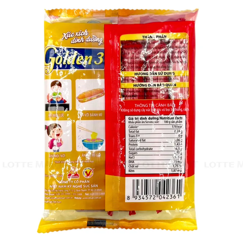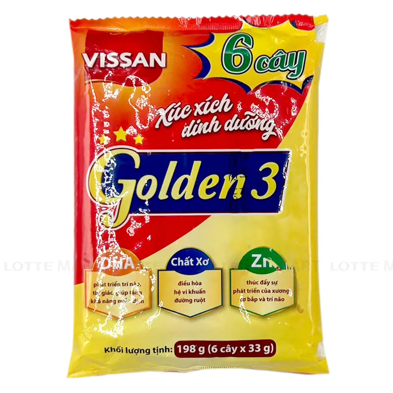 - Xúc Xích Tiệt Trùng Golden 3 Vissan Gói 198G – Dưỡng chất vàng cho nhà vô địch. Xúc xích dinh dưỡng Golden 3 có hương vị thơm ngon đặc biệt từ thịt heo nguyên chất cùng bộ ba dưỡng chất vàng gồm: DHA – hỗ trợ trí não phát triển, tăng khả năng miễn dịch, Chất xơ – điều hoà hệ vi khuẩn đường ruột, cùng Kẽm - thúc đẩy sự phát triển của xương, cơ bắp và trí não cho sự phát triển toàn diện.