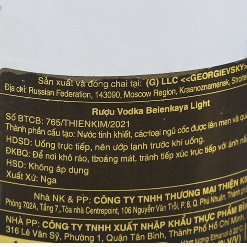 - Rượu Vodka Belenkaya Light 31% ABV Chai 500Ml có màu sắc trong suốt như pha lê, được sản xuất từ nguồn nước tinh khiết và những hạt ngũ cốc chất lượng cao nhất của nước Nga. Rượu được sản xuất trên dây truyền công nghệ hiện đại, kết hợp với một công thức độc đáo với bộ lọc đặc biệt thông qua 13 mét của bộ lọc than, đã tạo ra sự nổi bật với hương thơm tinh tế, hương vị mềm, cho thấy được sự phong phú của nền văn hóa rượu vodka của Nga .
