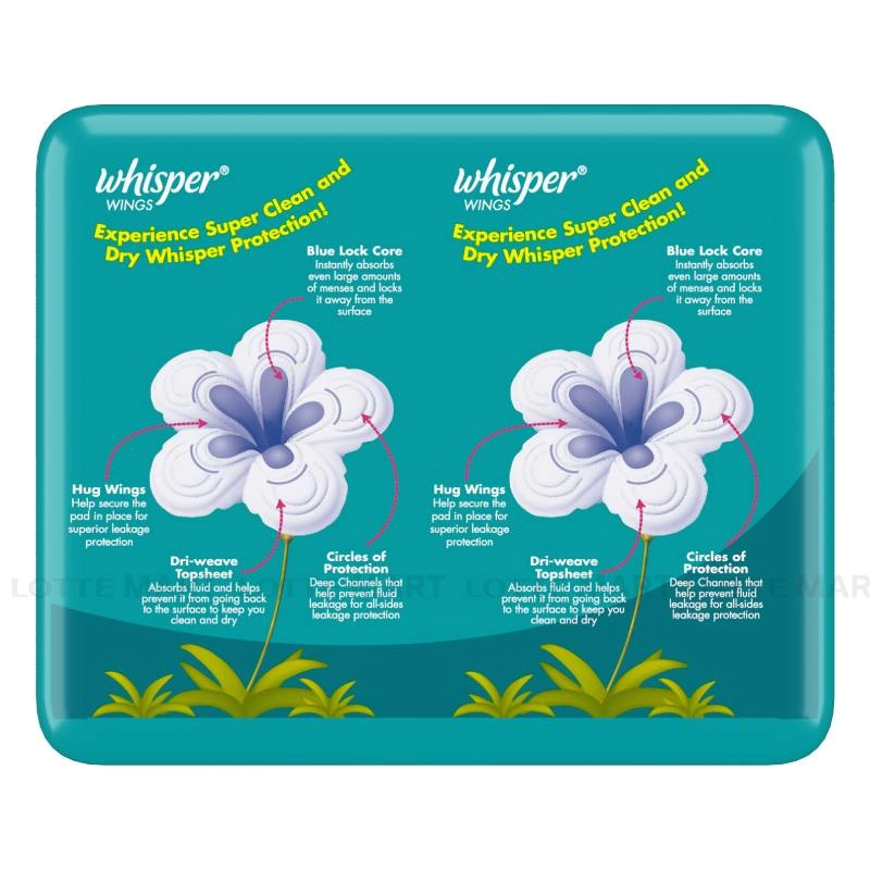 Băng Vệ Sinh Whisper Cotton có cánh với hệ thống rãnh bảo vệ blue lock core khóa chất lỏng, chống tràn, ngăn thấm ngược, cho bề mặt luôn khô thoáng.