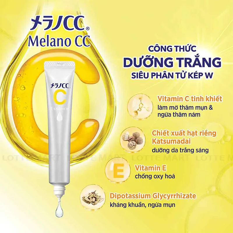 Serum Melano CC Dưỡng Sáng Da Ngừa Thâm Nám 20ml là sản phẩm tinh chất dưỡng sáng da mờ thâm nám bán chạy nhất của thương hiệu Melano CC (Nhật Bản), với sự kết hợp giữa Vitamin C tinh khiết và Vitamin E có khả năng thẩm thấu sâu vào lớp đáy da, giúp ức chế sự hình thành hắc tố melanin, từ đó làm giảm và ngăn ngừa vết thâm nám, tàn nhang, dưỡng da sáng mịn từ bên trong.