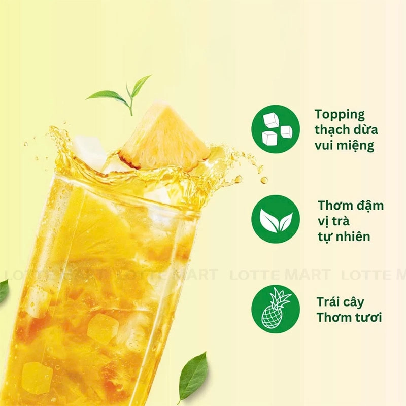 - Topping trái cây tươi: Thạch dừa (36%), đường, dứa (thơm) (15%), mạch nha, nước, chiết xuất quả dành dành,...