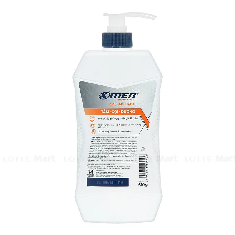 - Dầu Tắm Gội 3 In1 X-Men Clean & Fresh Sạch Gàu 610g loại bỏ vảy gàu ngay từ lần gội đầu tiên với công thức chứa hoạt chất Piroctone Olamine - thành phần an toàn dùng cho cả da đầu và toàn thân.