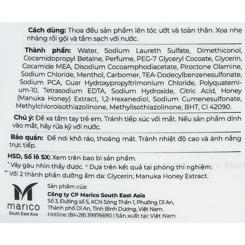 - Công thức chứa tinh chất bạc hà, chiết xuất mật ong manuka cùng hoạt chất piroctone olamine, sản phẩm không chỉ đảm bảo an toàn mà đặc biệt còn hỗ trợ loại bỏ vảy gàu từ lần gội đầu tiên, giúp dưỡng ẩm da đầu và toàn thân, mang đến cảm giác sảng khoái khi dùng cũng như có thể lưu lại hương thơm nhiệt đới đến tận 12 giờ.