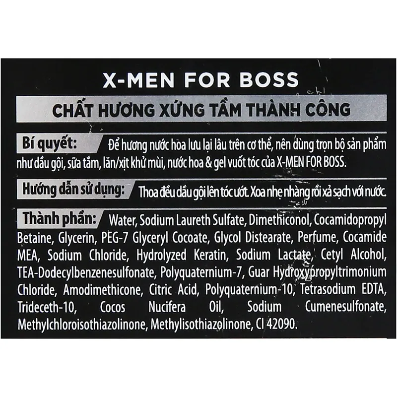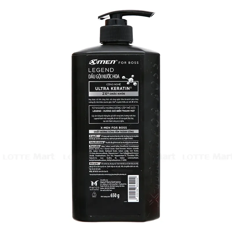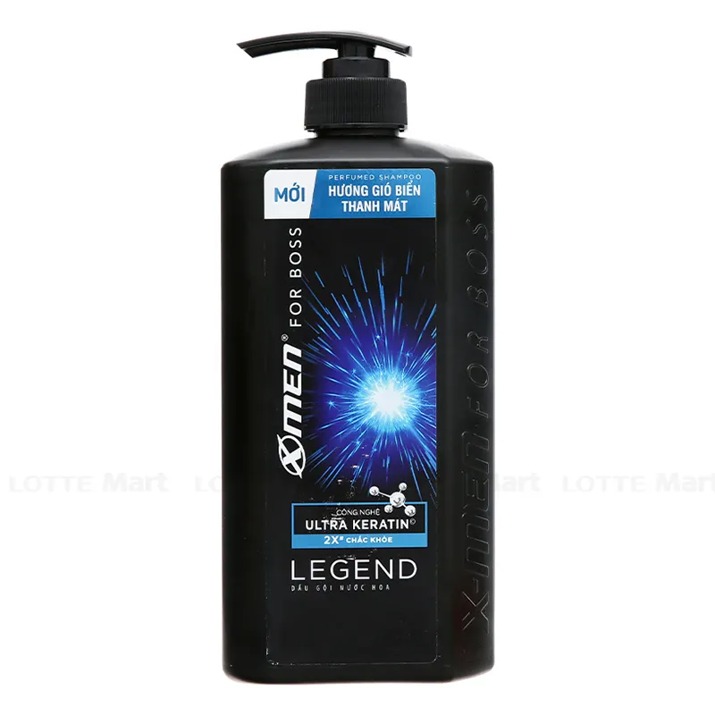 - Dầu Gội Nước Hoa X-Men For Boss Legend Keratin Hương Gió Biển 850g được cải tiếng với công thức Ultra Keratin giúp tăng cường độ chắc khỏe của tóc gấp 2 lần và giảm thiểu các vấn đề về tóc