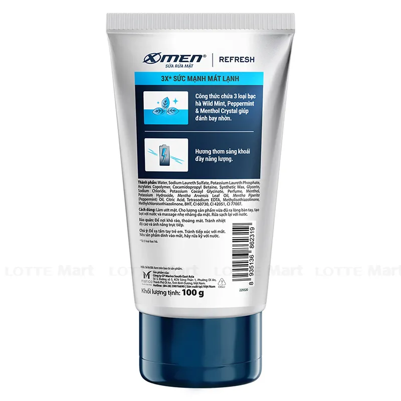 Sữa rửa mặt X-Men Go REFRESH 3 Loại Bạc Hà 100G Sữa rửa mặt dành cho nam giới với 3 loại bạc hà đầu tiên tại Việt Nam. Sản phẩm giúp nuôi dưỡng da, kiểm soát nhờn và thu nhỏ lỗ chân lông Làm sạch sâu, loại bỏ rất bụi bẩn, bã nhờn, tế bào chết trên bề mặt da và sâu trong lỗ chân lông