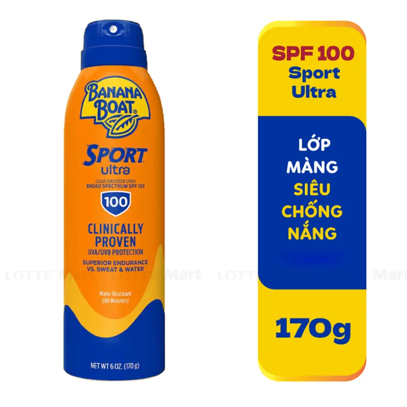 - Xịt Chống Nắng Thể Thao Banana Boat Sport SPF 100 170g là sản phẩm kem chống nắng dạng xịt đến từ thương hiệu Banana Boat của Mỹ, với chỉ số chống nắng cao có khả năng bảo vệ mạnh mẽ khỏi các tác hại của tia UV. Sản phẩm được thiết kế đặc biệt cho những người đam mê thể thao và thường xuyên hoạt động dưới ánh nắng mặt trời, ngăn da khỏi bỏng rát, cháy nắng.