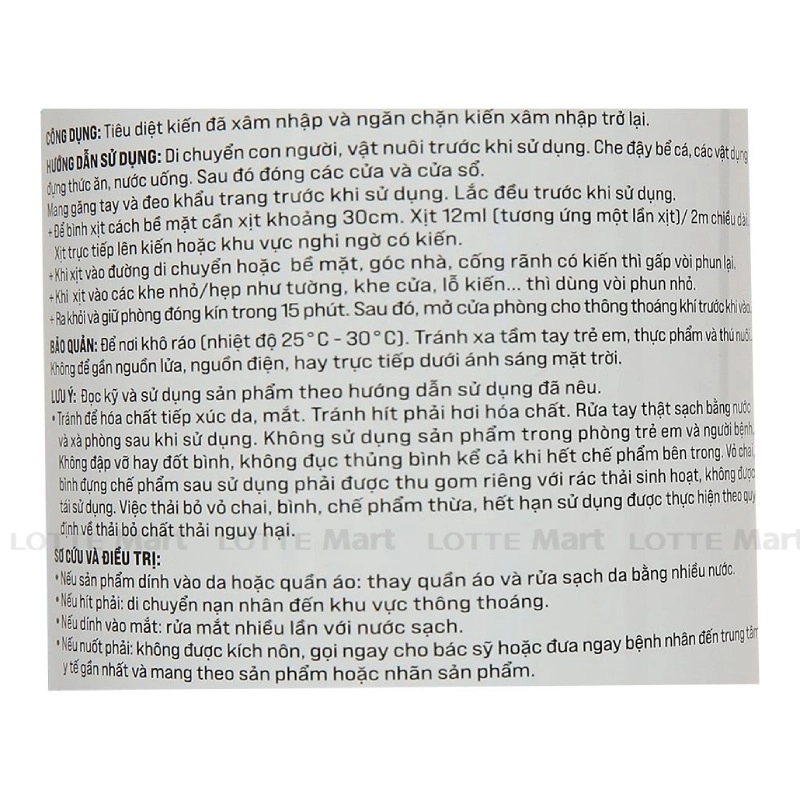 - Đối với ruồi, muỗi: Giữ bình thẳng đứng và phun vào không khí trong 15 giây, sau đó ra khỏi phòng đóng kín cửa phòng khoảng 15 phút rồi mở cửa, thông gió cho phòng trước khi vào lại.
