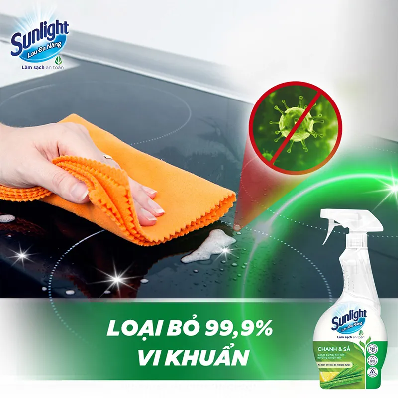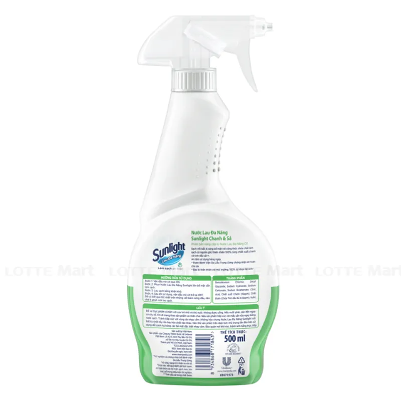- Nước Lau Đa Năng Sunlight Thiên Nhiên Chanh Sả 500ml với công thức chứa chất làm sạch có nguồn gốc 100% thiên nhiên giúp làm sạch vết bẩn và sáng bề mặt để bạn an tâm sử dụng mỗi ngày. Ưu điểm nổi bật: Kết hợp sức mạnh từ thiên nhiên của chanh và sả chỉ trong một chai xịt, giúp lau dầu mỡ dễ dàng mà không cần tốn thời gian tự pha chế. Công thức có độ pH trung tính, dịu nhẹ và an toàn trên da, được Bệnh Viện Da Liễu Trung Ương thử nghiệm và chứng nhận.