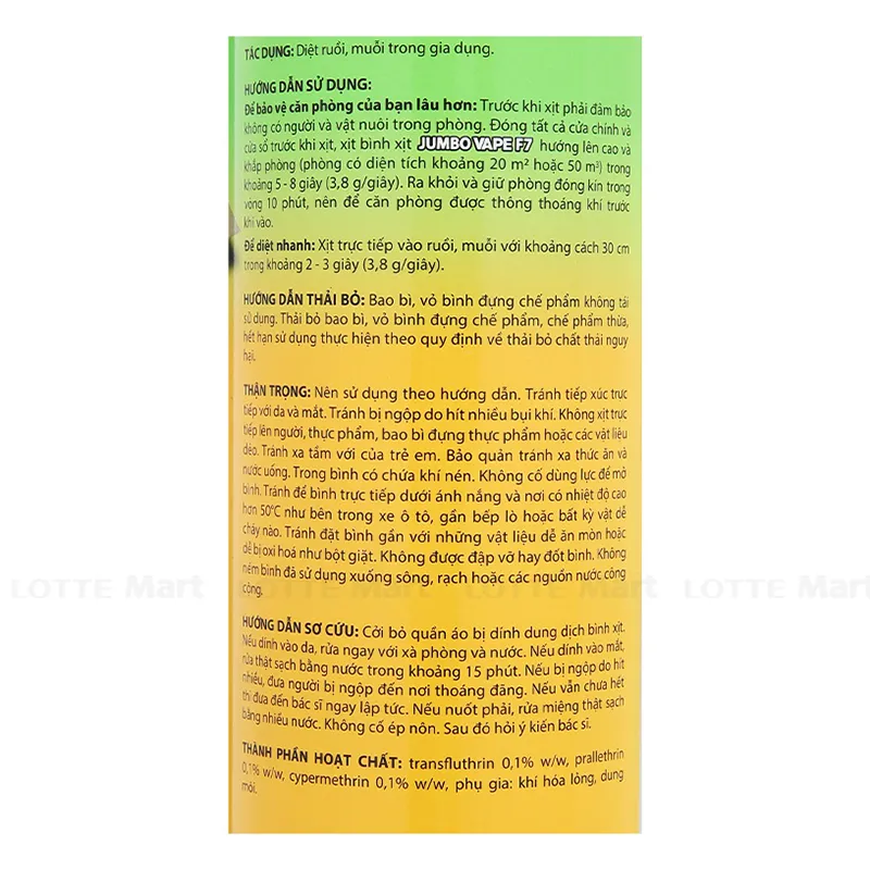 - Bảo quản bình xịt muỗi Jumbo Vape ở nơi khô thoáng, tránh ánh nắng mặt trời chiếu trực tiếp. Không để ở nơi có nhiệt độ cao hơn 50 độ C, để xa nơi có thức ăn và nước uống, hoặc nơi có những vật liệt dễ bị oxi hóa như bột giặt.