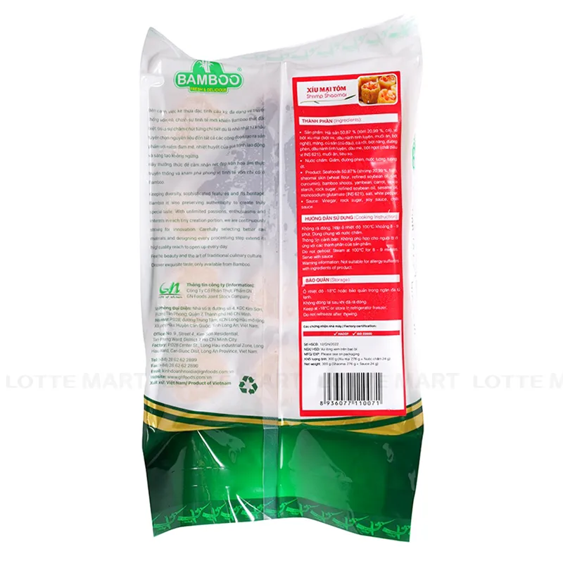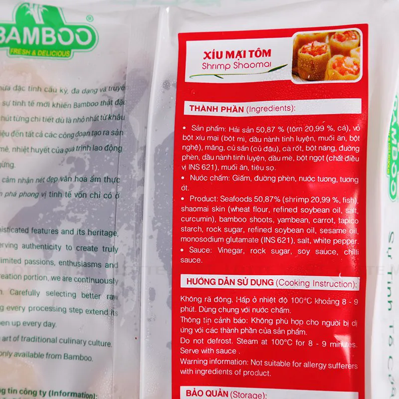 - Xíu Mại Tôm Bamboo Gói 300G được chế biến từ tôm, cá, mực, nấm đông cô, sả, hành lá, hành tây, vỏ bột mì… mang đến hương vị đặc biệt thơm ngon cho bữa ăn gia đình thêm hoàn hảo. Sản phẩm được sản xuất trên dây chuyền công nghệ hiện đại, không chứa chất bảo quản, nên có thể yên tâm khi sử dụng.
