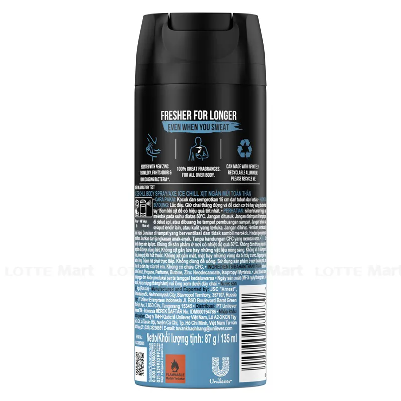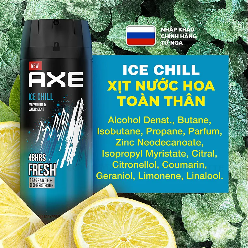 Dạng xịt khử mùi cho nam từ thương hiệu AXE của Nga, có mùi thơm lôi cuốn. Xịt ngăn mùi toàn thân AXE Ice Chill hương thơm sảng khoái, thơm mát của chanh tươi và lá bạc hà giúp khử mùi, ngăn tiết mồ hôi hiệu quả, đồng thời mang đến hương thơm quyến rũ cho phái mạnh tự tin trong mọi hoạt động.