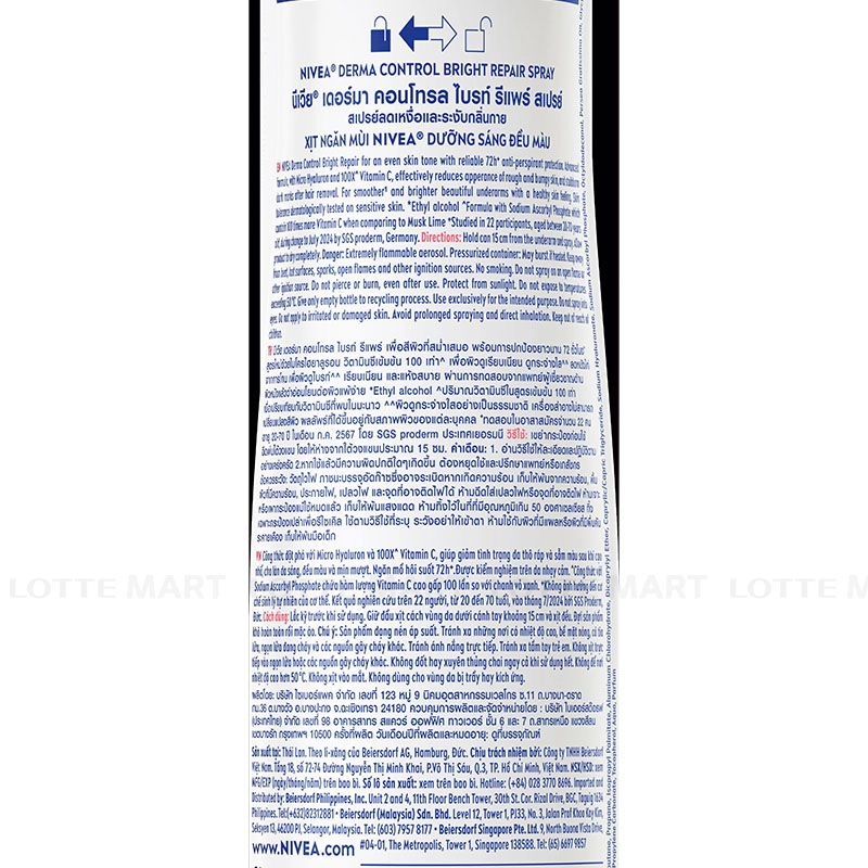 Xịt Ngăn Mùi Nivea Derma Control Dưỡng Sáng Và Đều Màu được sử dụng Aluminum Chlorohydrate để giảm tiết mồ hôi hiệu quả và mang dạng xịt tiện lợi, giúp vùng da dưới cánh tay khô thoáng.