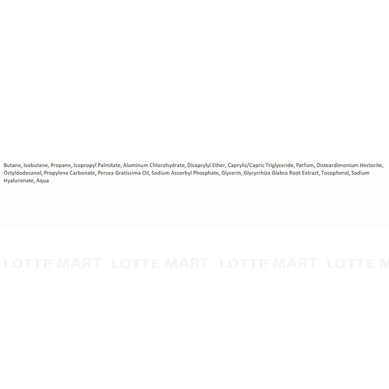 - Butane, Isobutane, Propane, Isopropyl Palmitate, Aluminum Chlorohydrate, Dicaprylyl Ether, Caprylic/Capric Triglyceride, Parfum, Disteardimonium Hectorite, Octyldodecanol, Propylene Carbonate, Persea Gratissima Oil, Sodium Ascorbyl Phosphate, Glycerin, Glycyrrhiza Glabra Root Extract, Tocopherol, Sodium Hyaluronate, Aqua