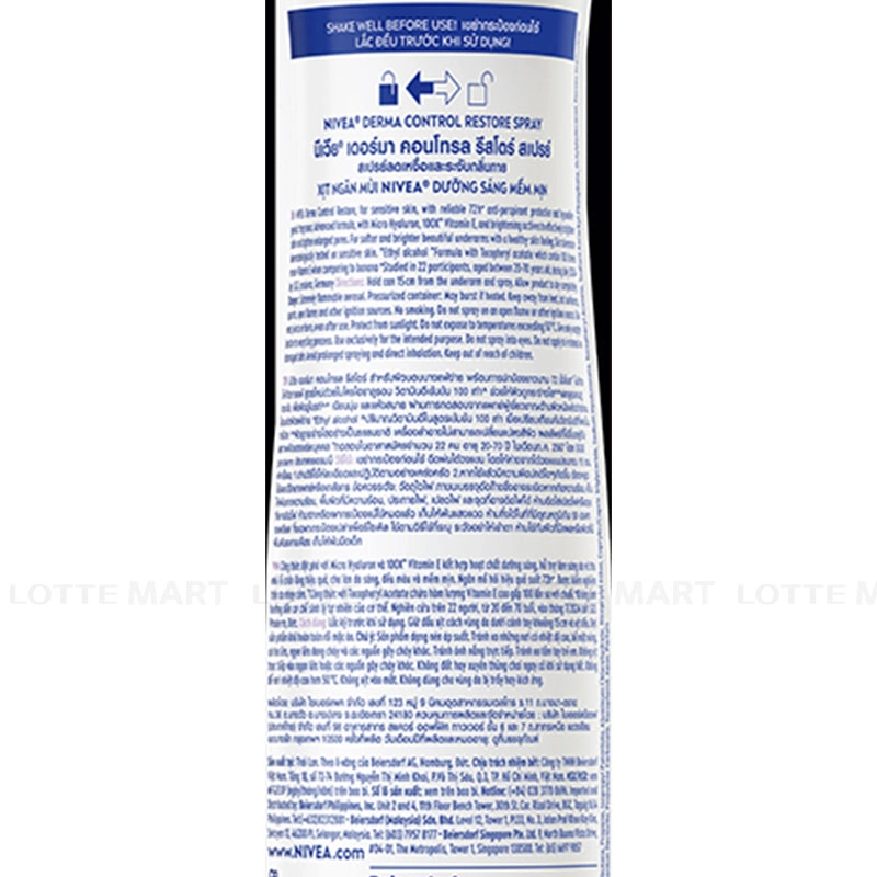 Xịt Ngăn Mùi Nivea Derma Control Dưỡng Sáng Và Mềm Mịn hoạt động hiệu quả nhờ Aluminum Chlorohydrate (chất chống mồ hôi) và mang dạng xịt tiện lợi, khô thoáng, giúp ngăn mùi và giảm tiết mồ hôi suốt cả ngày.