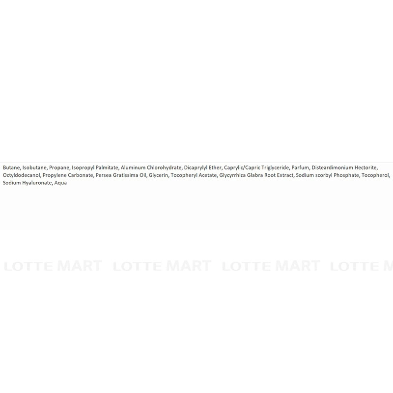 - Butane, Isobutane, Propane, Isopropyl Palmitate, Aluminum Chlorohydrate, Dicaprylyl Ether, Caprylic/Capric Triglyceride, Parfum, Disteardimonium Hectorite, Octyldodecanol, Propylene Carbonate, Persea Gratissima Oil, Glycerin, Tocopheryl Acetate, Glycyrrhiza Glabra Root Extract, Sodium scorbyl Phosphate, Tocopherol, Sodium Hyaluronate, Aqua