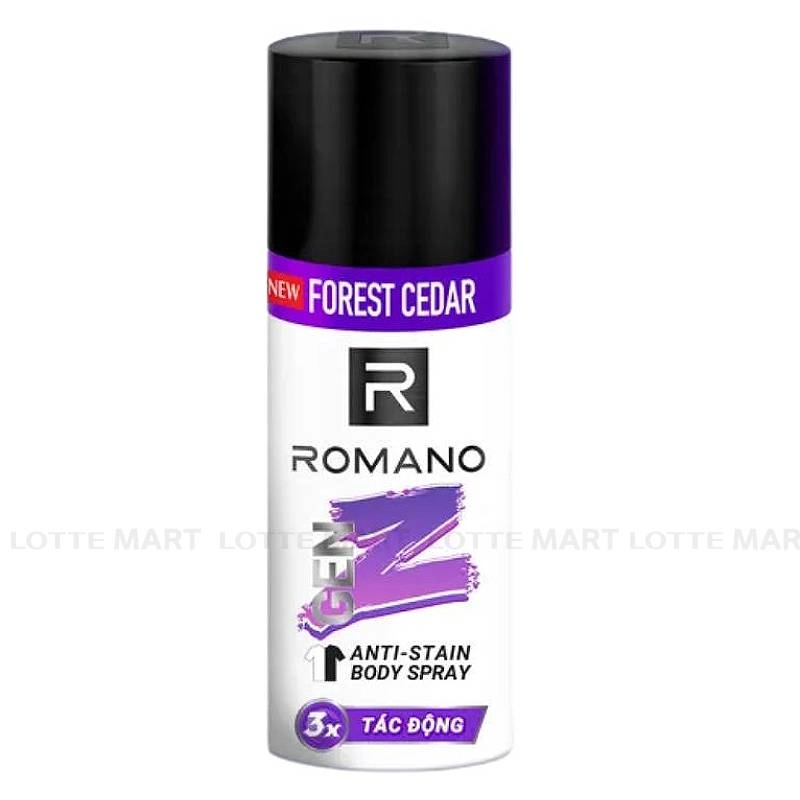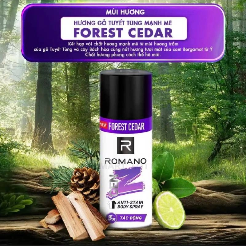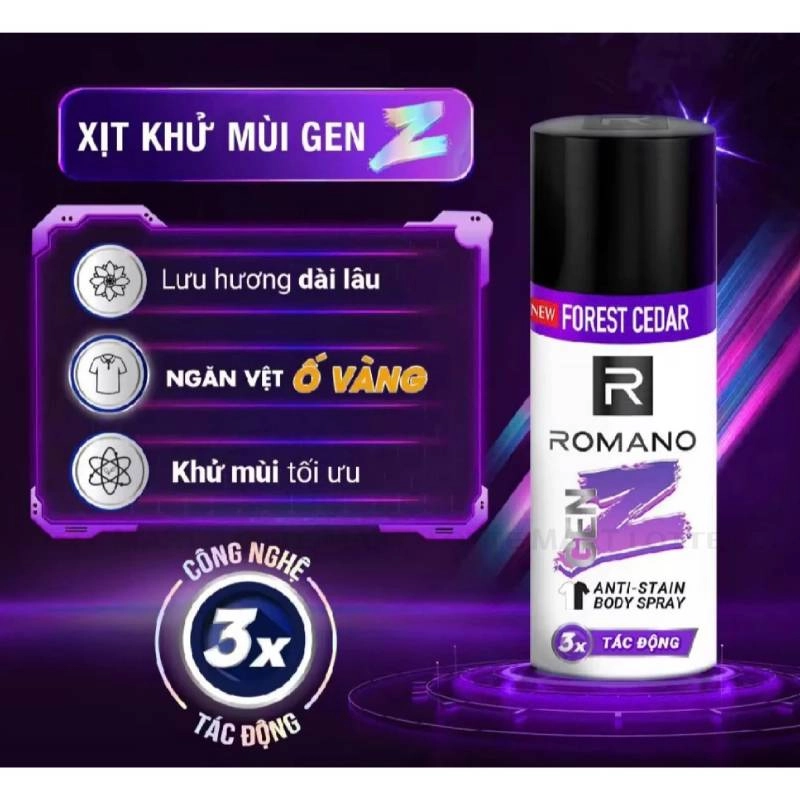 - Xịt Ngăn Mùi Romano GenZ Hương Gỗ Tuyết Tùng x3 Tác Động chứa công thức cải tiến giúp ngăn hình thành vệt ố vàng, vệt trắng, cho vùng da dưới cánh tay luôn khô thoáng và lưu hương suốt ngày dài.