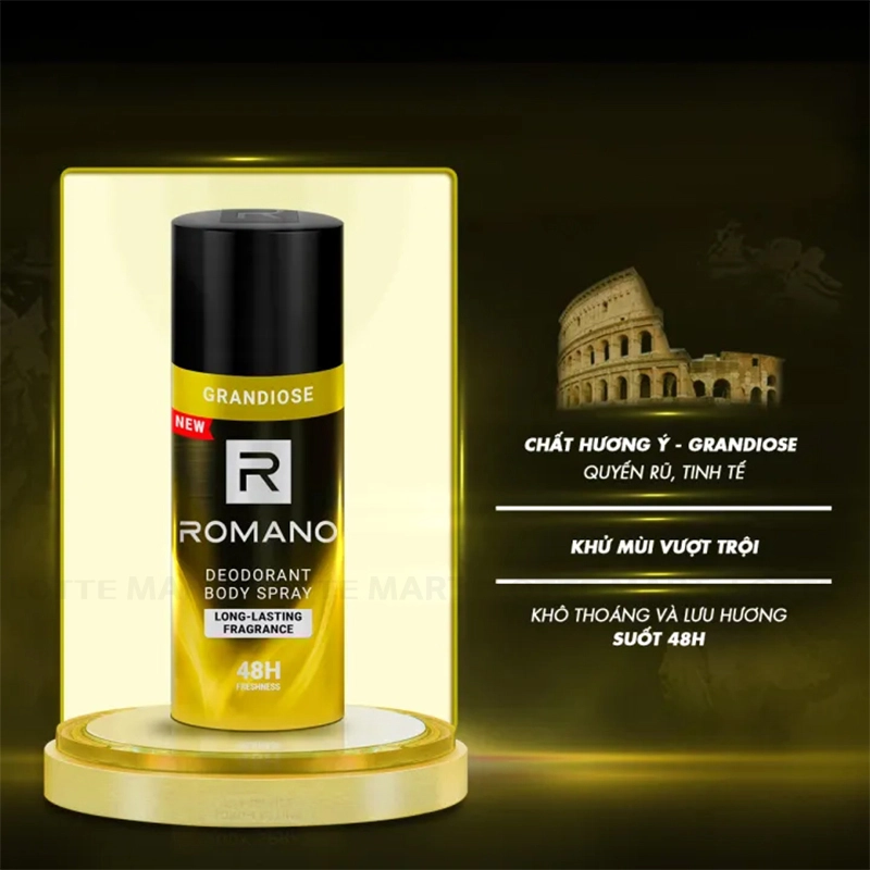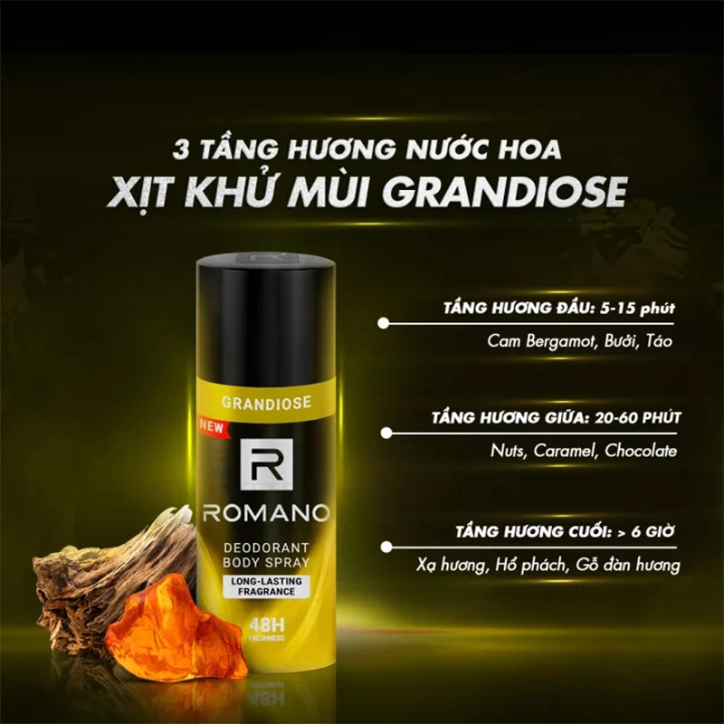 - Xịt Ngăn Mùi Romano Grandiose 48H Chai 150ml với hương thơm nam tính giúp mang lại sự tự tin cùng đẳng cấp dành cho phái mạnh.