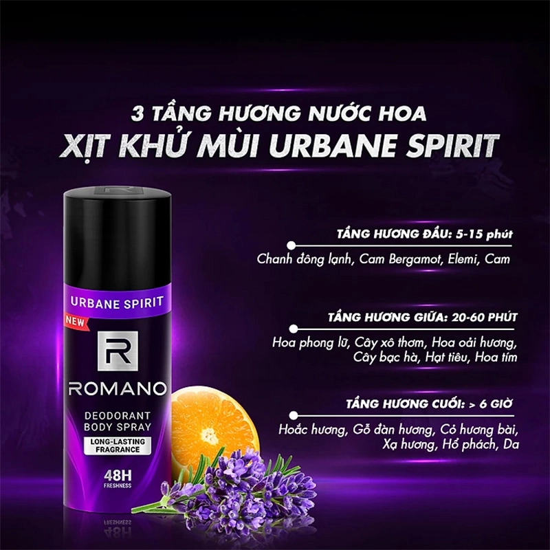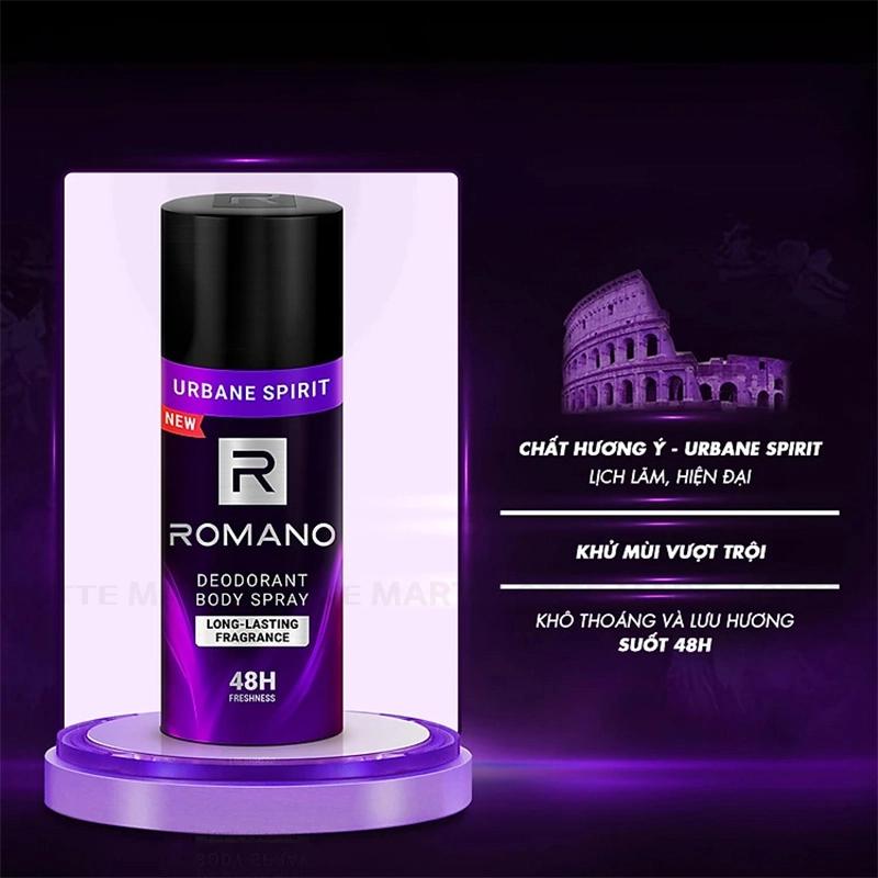 - Xịt Ngăn Mùi Romano Urbane Spirit 48H Chai 150ml với hương thơm nam tính giúp mang lại sự tự tin cùng đẳng cấp dành cho phái mạnh.