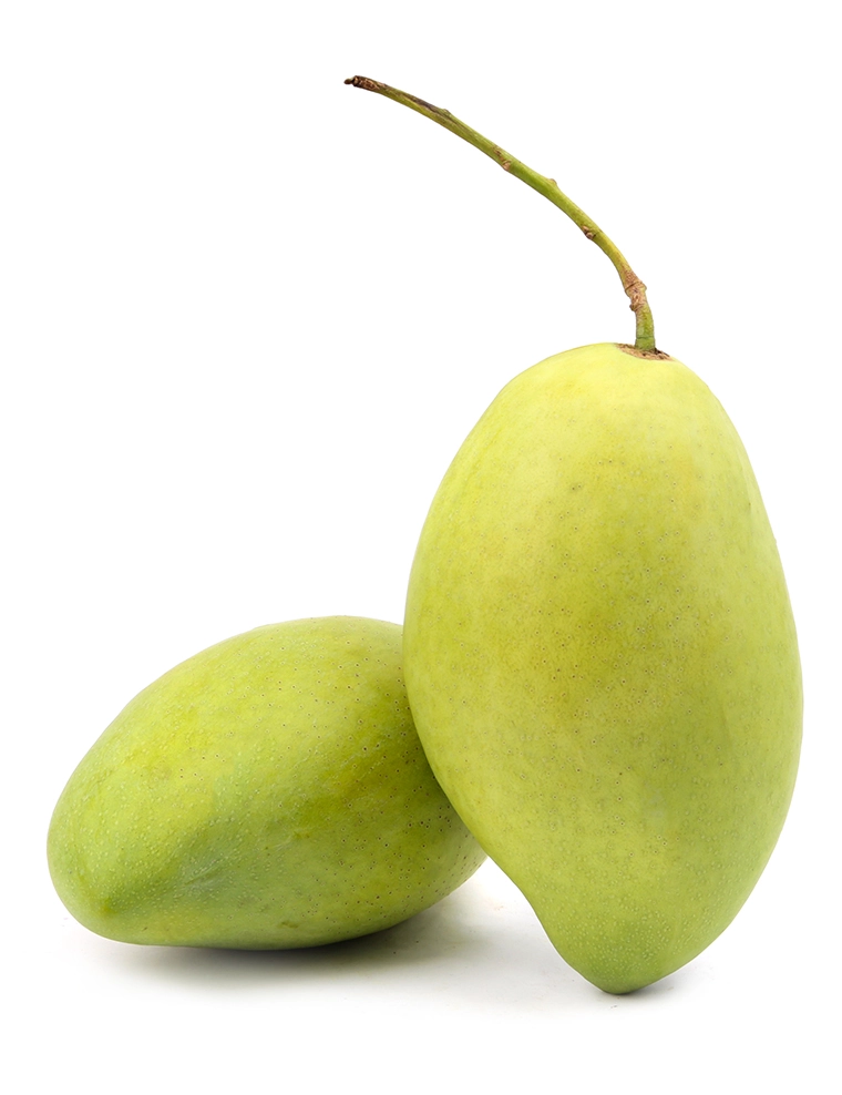 - Quả xoài có hình dạng thuôn dài, tròn ở phần cuống và hơi dẹt ở phần chóp. Vỏ mỏng, khi chín có màu vàng tươi.