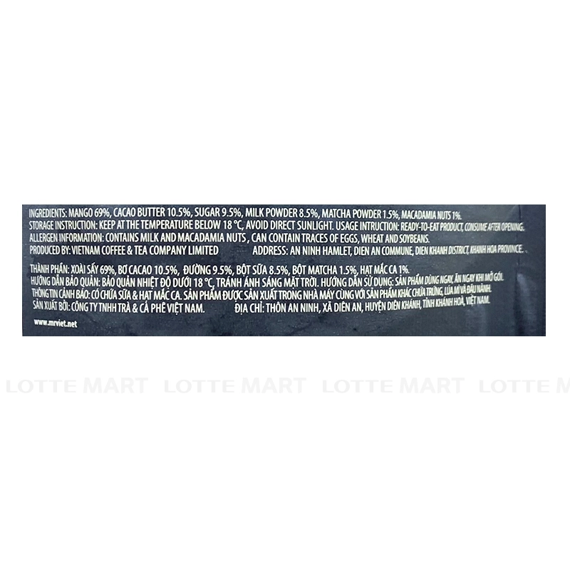 - Xoài sấy 69%, bơ ca cao 10.5%, đường 9.5%, bột sữa 8.5%, bột matcha 1.5%, hạt mắc ca 1%.