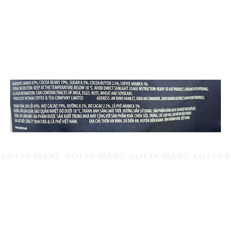 - Xoài sấy 69%, hạt cacao 19%, đường 8.5%, bơ cacao 2.5%, cà phê Arabica 1%.
