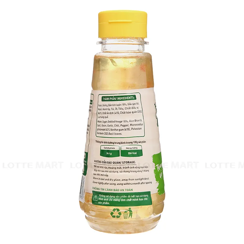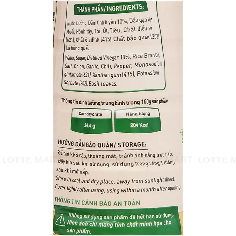 - Nước, đường, dấm tinh luyện 10%, dầu gạo lứt, muối, hành tây, tỏi, ớt, tiêu, chất điều vị (621), chất ổn định (415), chất bảo quản (202), lá húng quế.