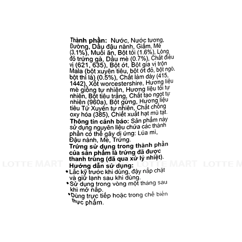 - Nước, Nước tương, Đường, Dầu đậu nành, Giấm, Mè (3.1%), Muối ăn, Bột tỏi (1.6%), Lòng đỏ trứng gà, Dầu mè (0.7%), Chất điều vị (621, 635), Bột ớt, Bột gia vị trộn Mala (bột xuyên tiêu, bột ớt đỏ, bột ngò, bột thì là) (0.5%), Chất làm dày (415, 1442), Xốt worcestershine, Hương liệu mè giống tự nhiên, Hương liệu tỏi tự nhiên, Bột tiêu trắng, CHất tạo ngọt tự nhiên (960a), Bột gừng, Hương liệu tiêu tứ xuyên tự nhiên, Chất chống oxy hóa (385), Chiết xuất mù tạt.