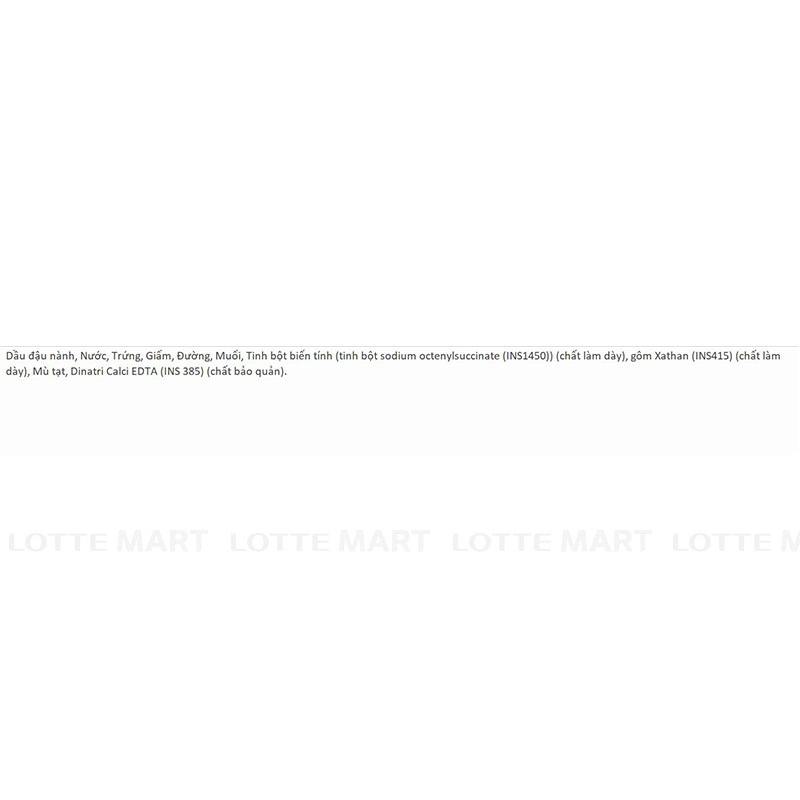 - Dầu đậu nành, Nước, Trứng, Giấm, Đường, Muối, Tinh bột biến tính (tinh bột sodium octenylsuccinate (INS1450)) (chất làm dày), gôm Xathan (INS415) (chất làm dày), Mù tạt, Dinatri Calci EDTA (INS 385) (chất bảo quản).