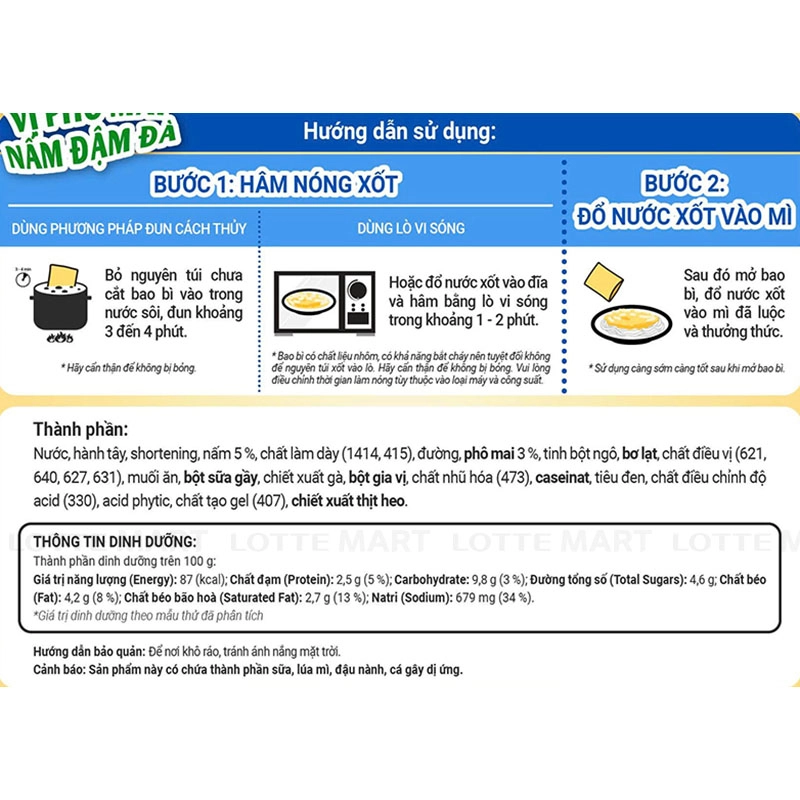 Bỏ nguyên túi chưa cắt bao bì vào trong nước sôi, đun khoảng 3-4 phút hoặc đổ nước xốt ra đĩa và đun bằng lò vi sóng trong khoảng 1-2 phút. Sau đó mở bao bì đổ nước xốt vào mì đã luộc và thưởng thức.
