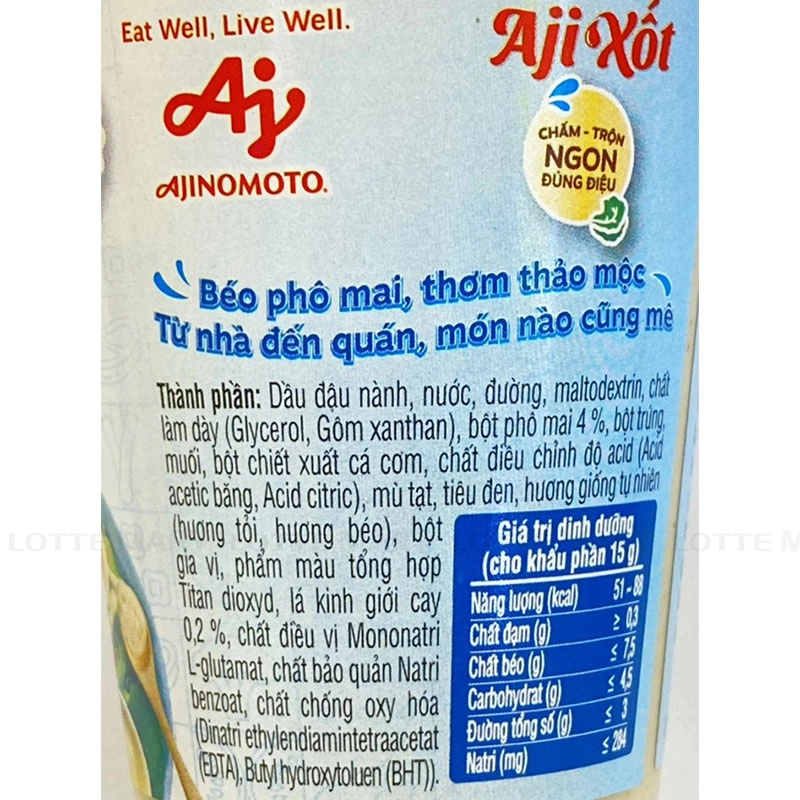 - Dầu đậu nành, nước, đường, maltodextrin, chất làm dày (Glycerol, Gôm xanthan), bột phô mai 4 %, bột trứng, muối, bột chiết xuất cả cơm, chất điều chỉnh độ acid (Acid acetic băng, Acid citric), mù tạt, tiêu đen, hương giống tự nhiên (hương tỏi, hương béo), bột gia vị, phẩm màu tổng hợp Titan dioxyd, lá kinh giới cay 0,2 %, chất điều vị Mononatri L-glutamat, chất bảo quản Natri benzoat, chất chống oxy hóa (Dinatri ethylendiamintetraacetat (EDTA), Butyl hydroxytoluen (BHT))