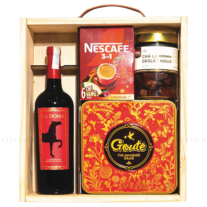 Hộp quà bao gồm 4 món sang trọng và tinh tế là Rượu Vang Đỏ La Doma Tempranillo Medium Dry 13% ABV Chai 750ml, Bánh Quy Gouté Solo Hộp 237.6G, Chà Là Hộp 360G và Cà Phê Hòa Tan NesCafé 3In1 Vị Nguyên Bản 320G.