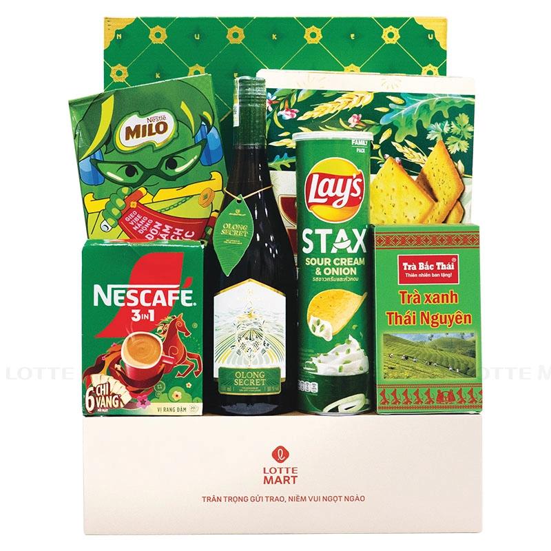 Giỏ quà bao gồm 9 món đa dạng là Rượu Vang Chateu Dalat Olong Secret 11.5% ABV Chai 750ml, cùng với các sản phẩm thiết yếu như Cà Phê Hòa Tan NesCafé 3In1 Vị Rang Đậm Hộp 20 Gói x 17G, Thức Uống Lúa Mạch Néstle Milo Active-Go Hộp 285G, Bánh Quy Kenju Rau Củ Hộp 360G, Bánh AFC Rau Củ Hộp 279.5G, Trà Xanh Đại Gia Thái Nguyên Hộp 80G, Snack Khoai Tây Lays Stax Vị Kem Chua Hành Hộp 150G, Bánh Socola Pie LOTTE CHOCOLAT Vị Trà Xanh Hộp 169.8G và Bánh Xốp Imperial Dừa Hộp 100G.