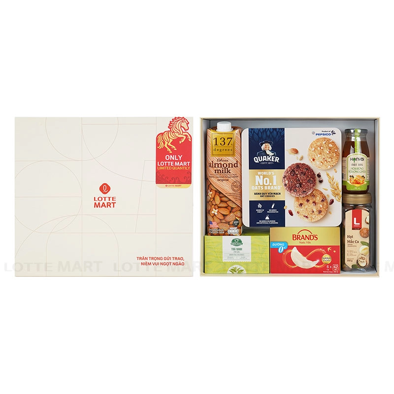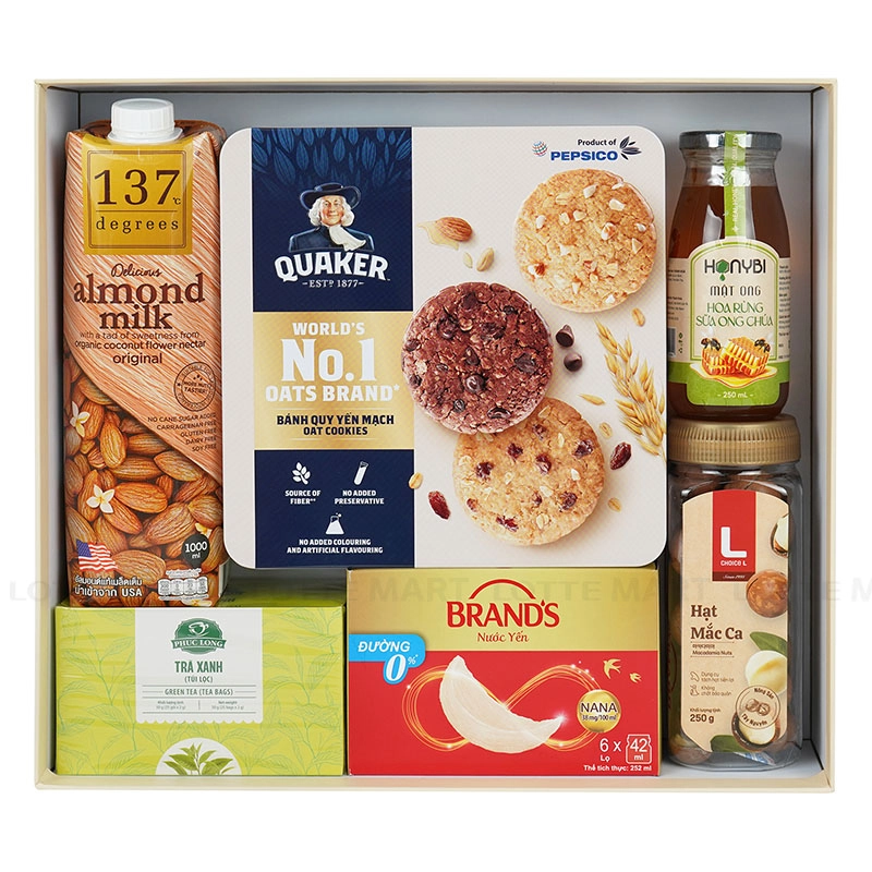 Hộp quà bao gồm 6 sản phẩm bổ dưỡng như hộp 6 Hũ Nước Yến Thiên Nhiên Không Đường Brand's 42G, Bánh Quy Yến Mạch Quaker Mix 3 Vị Hộp 400G, Trà Xanh Túi Lọc Phúc Long Hộp 25 Gói x 2G, Mật Ong Honybi Hoa Rừng Sữa Ong Chua Hũ 250ml, Hạt Mắc Ca Nứt Vỏ Chocie L Hộp 250G và Sữa Hạnh Nhân Nguyên Chất 137 Degrees Hộp 1L.