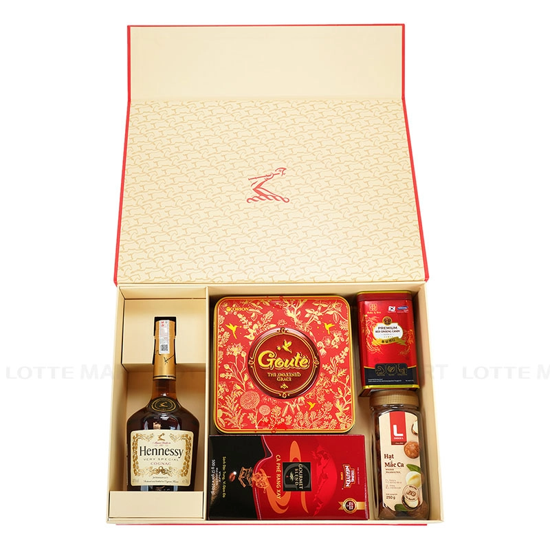 Hộp quà bao gồm 5 sản phẩm đến từ các thương hiệu nổi tiếng là Rượu Cognac Hennessy Very Special 40% ABV Chai 700ml, Cà Phê Rang Xay Gourmet Blend Trung Nguyên Hộp 500G, Hạt Mắc Ca Nứt Vỏ Chocie L Hộp 250G, Bánh Quy Gouté Solo Hộp 237.6G và Kẹo Hồng Sâm Hàn Quốc Ruby&Ben Hộp Thiếc 200G.