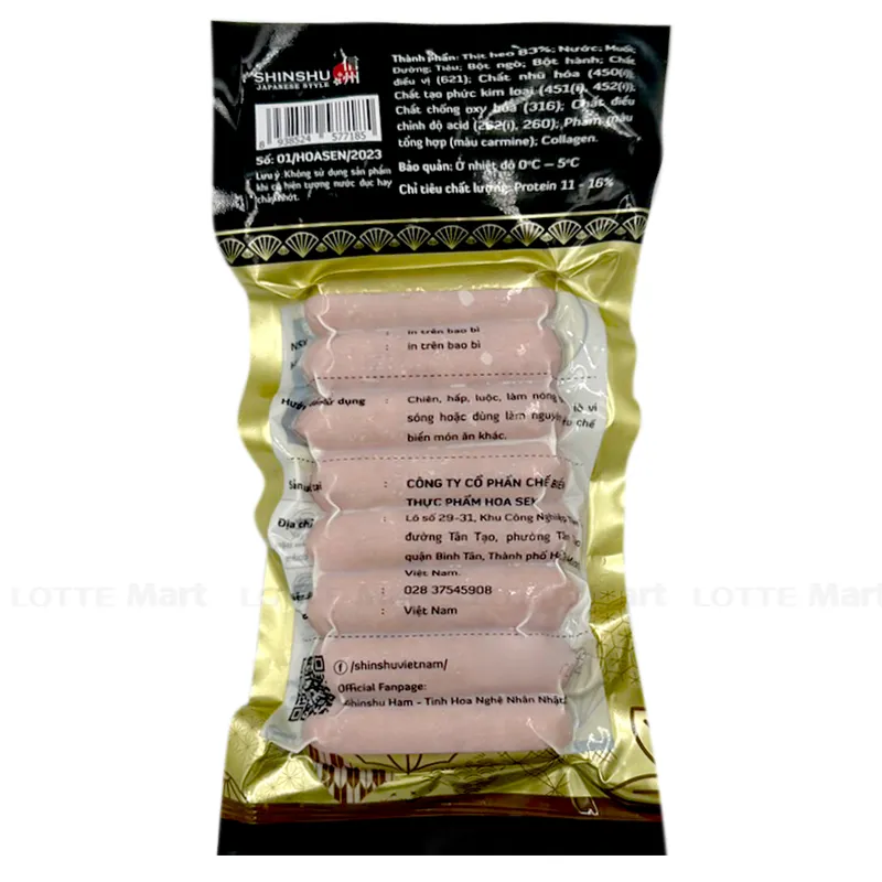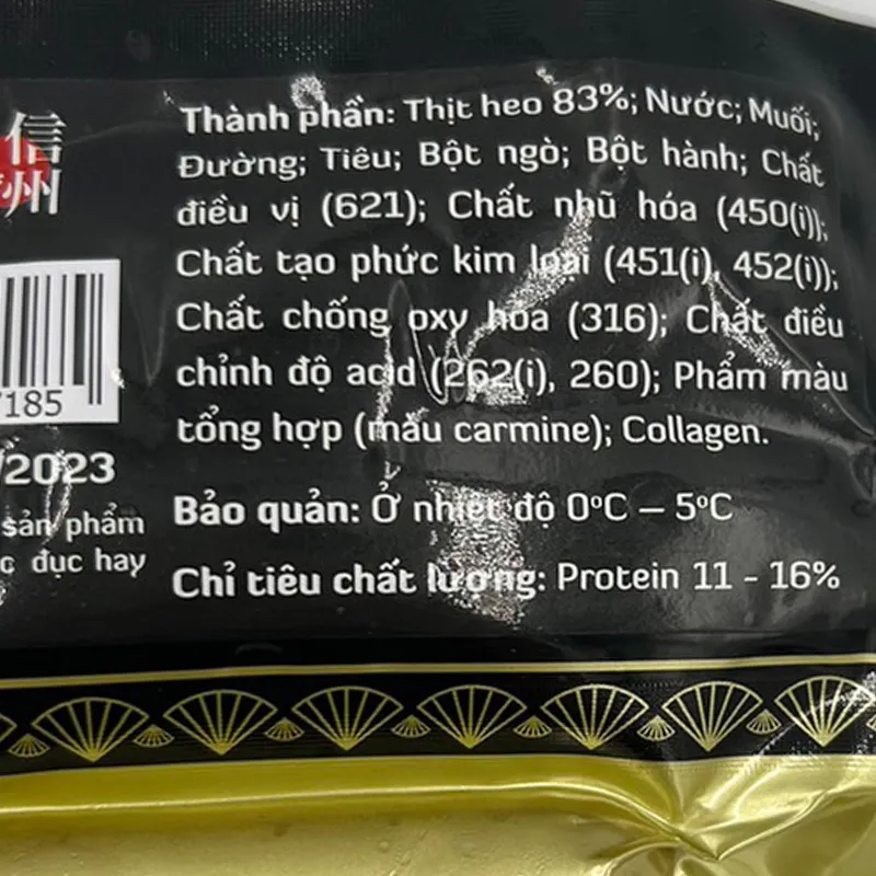 Thành phần: Thịt heo 83%; nước; muối; đường; tiêu; bột ngò; bột hành; chất điều vị (621); chất nhũ hóa (450(i)),...