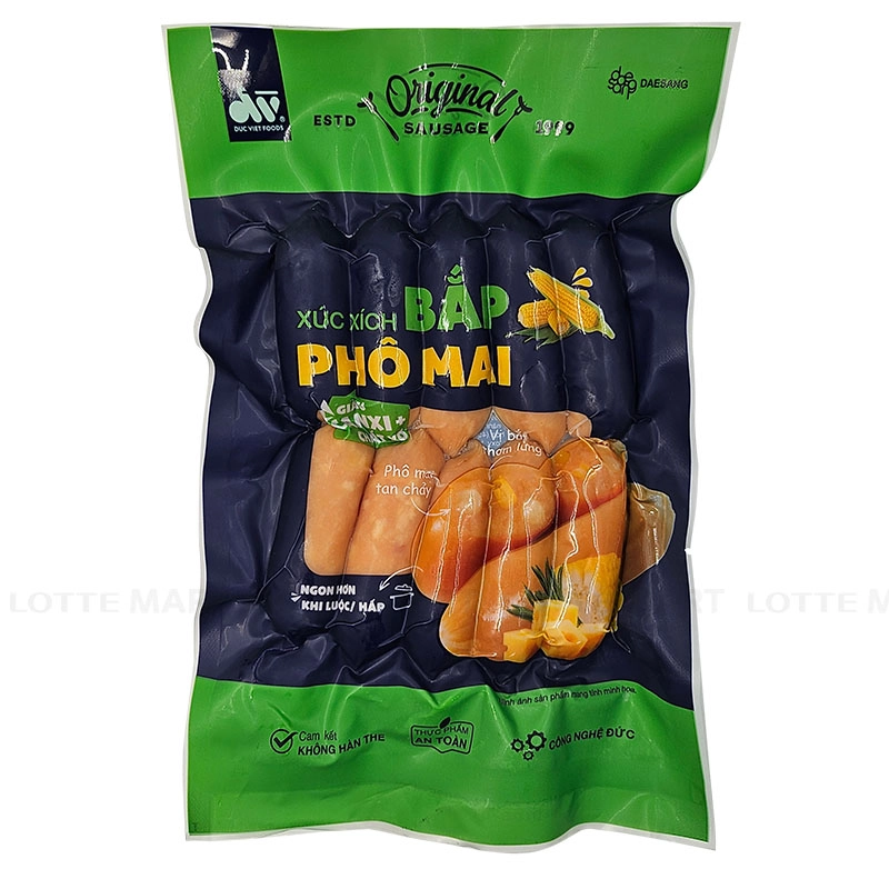 - Xúc Xích Bắp Phô Mai Đức Việt là phiên bản nâng cấp từ xúc xích Phô Mai Cheesy truyền thống, được bổ sung thêm thành phần bắp ngọt thơm ngon, mang đến trải nghiệm vị ngon phong phú và hấp dẫn hơn.