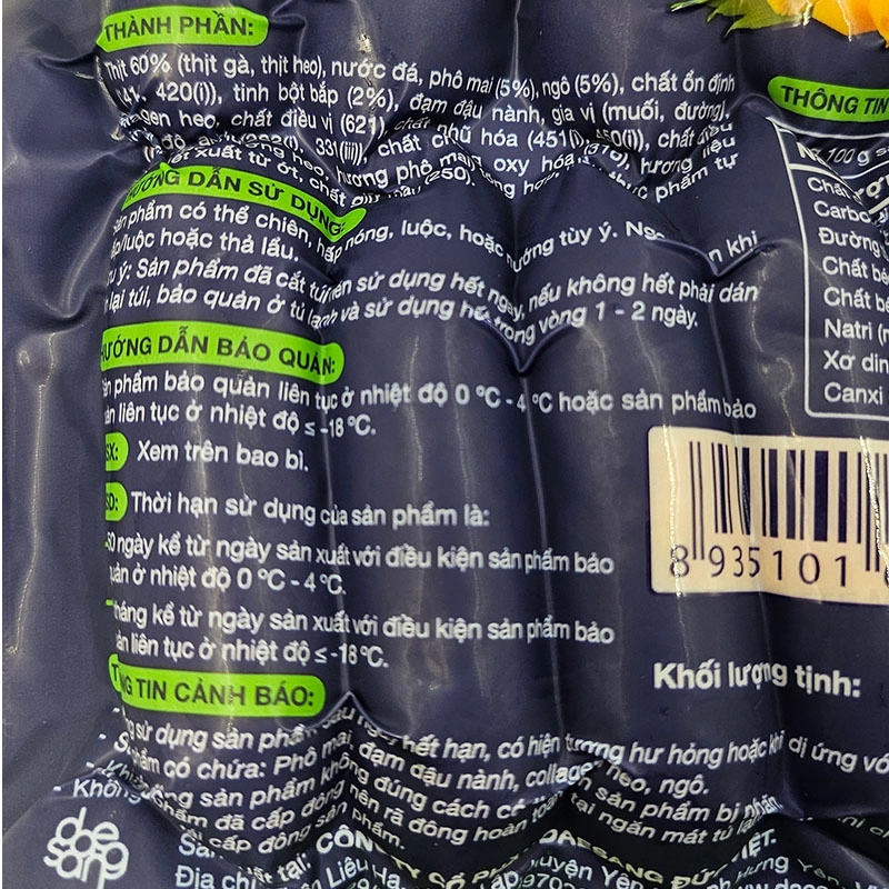 - Thịt heo, thịt gà (60%), nước đá, phô mai 5%, ngô 5%, chất ổn định, tinh bột bắp, đạm đậu nành, vỏ bọc bằng ruột collagen, chất nhũ hóa, chất điều chỉnh độ acid, chất chống oxy hóa, hương liệu tổng hợp, màu thực phẩm tự nhiên chiết xuất từ ớt, chất giữ màu.