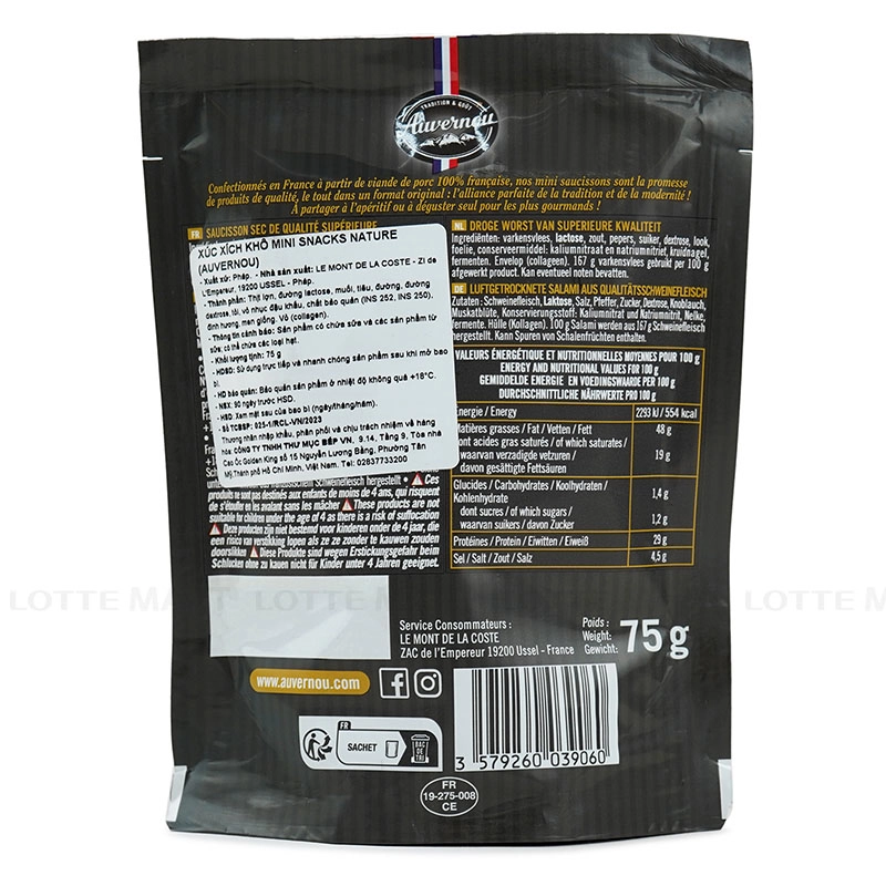 Thành phần: được làm từ 100% thịt heo cao cấp Pháp. Hương vị giòn, dai, thơm ngon, tinh tế là món ăn hoàn hảo để nhâm nhi cùng rượu vang.