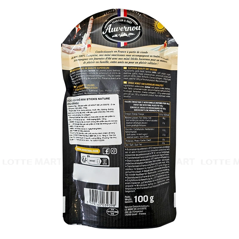 - Xúc Xích Khô Mini Sticks Nature Auvernou được làm từ thịt heo chất lượng cao, kết hợp cùng các gia vị tự nhiên như tỏi, tiêu và nhục đậu khấu, tạo nên hương vị đặc trưng tinh tế.