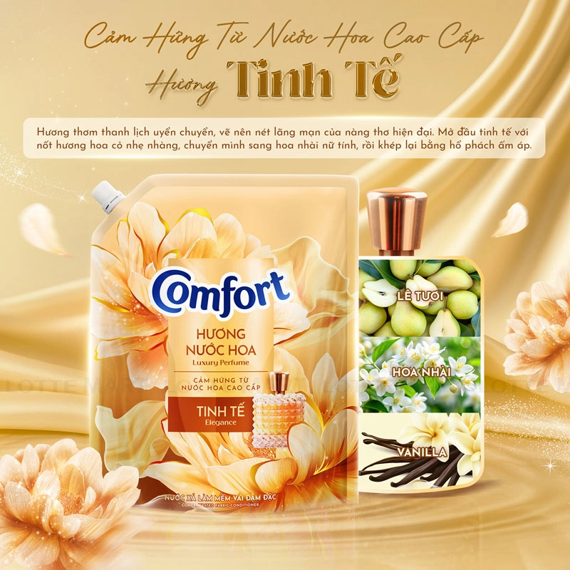 - Nước Xả Vải Comfort Hương Nước Hoa Thiên Nhiên Tinh Tế với công thức Chăm Sóc Chuyên Sâu Ultra Care thấm sâu vào từng sợi vải, giúp bảo vệ độ bền và giữ áo quần luôn tươi màu.