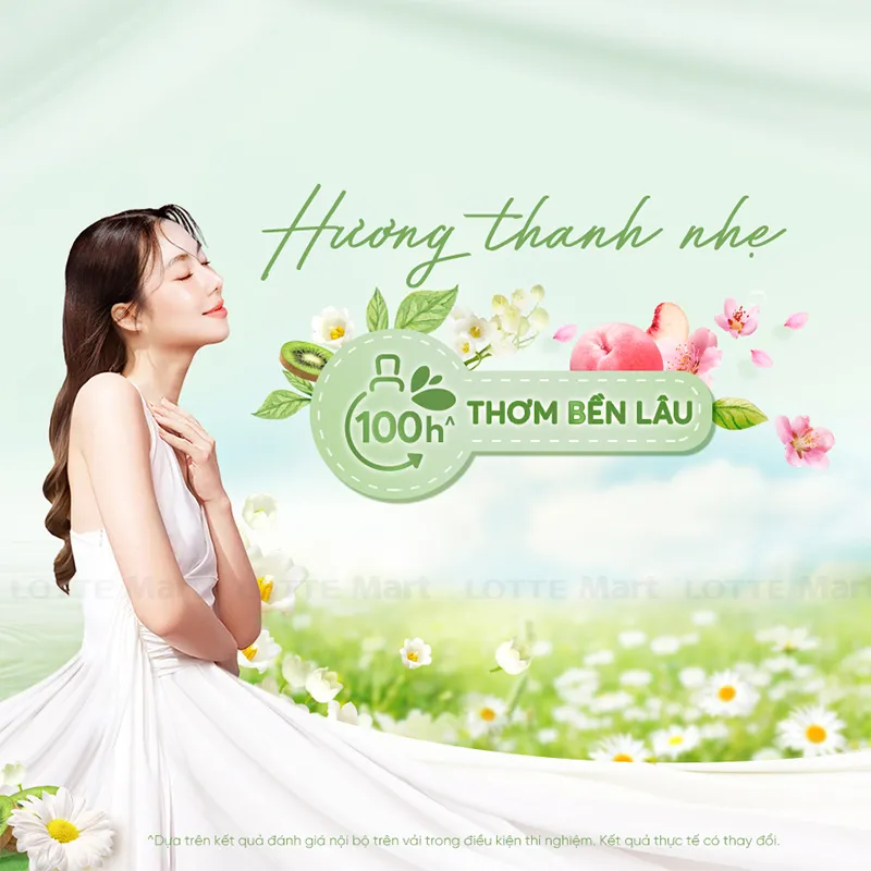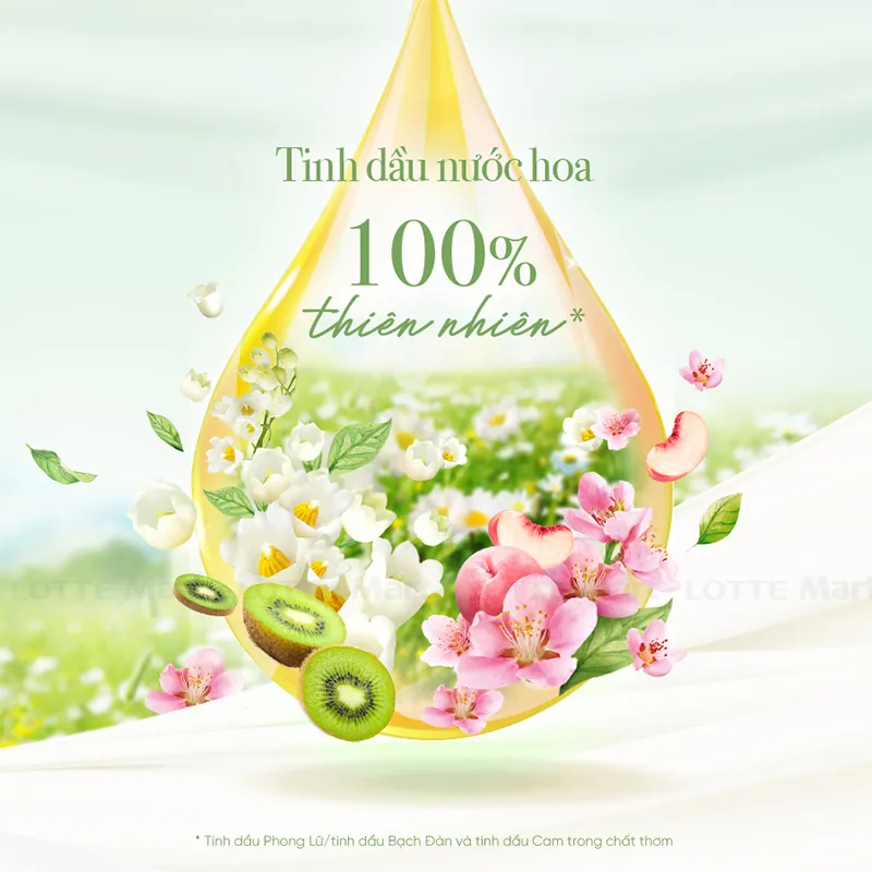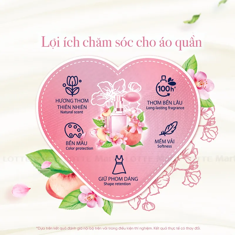 - Hương thơm thiên nhiên mang cảm hứng từ Hoa Anh Đào và Đào Tươi thanh ngọt, dịu nhẹ giúp chăm sóc quần áo mềm mại, giúp quần áo giữ dáng và bền màu.