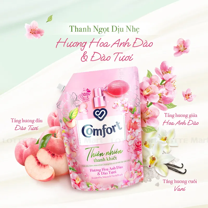 - Với tinh dầu nước hoa 100% thiên nhiên, hương hoa cỏ và trái cây cao cấp được chưng cất tỉ mỉ, Comfort mang đến hương thơm lấy cảm hứng từ Hoa Anh Đào & Đào Tươi mọng nước, tỏa hương tươi mát trong lành, không nồng gắt và bền lâu trên quần áo suốt 100 giờ